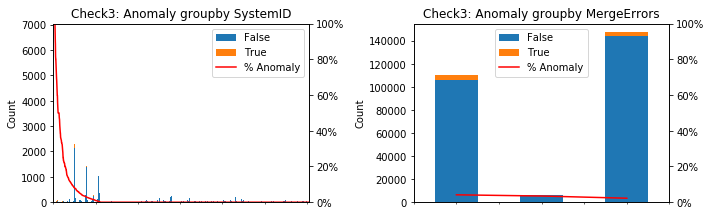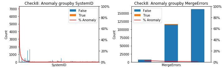 After removing the useless features, we were left with two categorical features: SystemID and MergeErrors. We considered the percentage of each anomaly in these features.