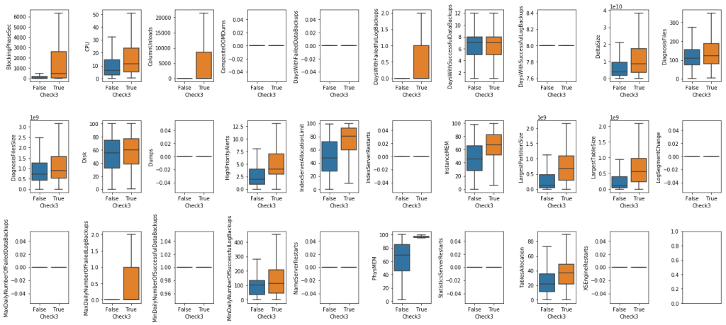 - For Check2: There are many informative features for classifying label 2 such as BlockingPhaseSec, CPU, ColumnUnloads, DiagnosisFiles, IndexServerAllocationLimit, PhysMEM, TableAllocation, etc but they cannot completely seperate classes.