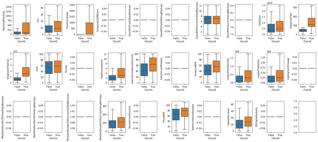 - For label Check6, the percent of anomaly of whole data is 29% while the anomaly percent where missing TableAllocation, PhysMEM, InstanceMEM and IndexServerAllocationLimit are 57%, 39%, 38% and 35%, respectively.
