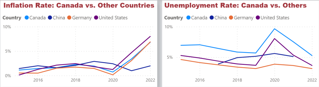 Looking at the period after 2020, Canada’s inflation rate is lower than the US, which is on par with Germany. However, its unemployment rate is higher compared to these countries.
